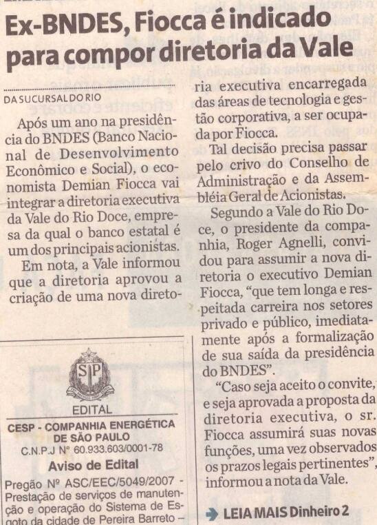 “Ex-BNDES, Fiocca é indicado para compor diretoria da Vale” Deixe um comentário / 2007, BNDES / Por admin